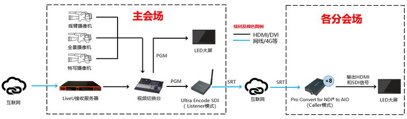 主會(huì)場(chǎng)部署的三臺(tái)影視高清攝像機(jī)拍攝的視頻信號(hào)連接到切換臺(tái),切換臺(tái)制作后將2路PGM信號(hào)分別輸出給2臺(tái)美樂(lè)威Ultra Encode SDI編碼盒(1主1備),編碼器作為SRT Listener,可最高支持連接8個(gè)客戶端,然后通過(guò)主會(huì)場(chǎng)移動(dòng)國(guó)家應(yīng)急通信車(chē)提供的網(wǎng)絡(luò)進(jìn)行互聯(lián)網(wǎng)傳輸;在其余8個(gè)會(huì)場(chǎng),美樂(lè)威解碼器和LED大屏連接,解碼器作為SRT Caller,把解碼后的SRT流輸出給大屏顯示供與會(huì)代表觀看;顒(dòng)期間,各分會(huì)場(chǎng)可清晰看到主會(huì)場(chǎng)輸出的PGM信號(hào),畫(huà)面流程清晰,現(xiàn)場(chǎng)感知良好,整場(chǎng)活動(dòng)受到了省市區(qū)(縣)政府及參會(huì)單位的一致好評(píng)。