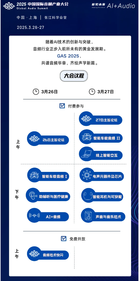 3月26-27日,2025中國國際音頻產(chǎn)業(yè)大會(huì)(GAS)將在上海 · 張江科學(xué)會(huì)堂召開。GAS 2025由中國電子音響行業(yè)協(xié)會(huì)和上海市浦東新區(qū)先進(jìn)音視頻技術(shù)協(xié)會(huì)共同主辦,上海國展展覽中心有限公司承辦。GAS 2025將以「聽見未來 AI+Audio」為主題,本屆大會(huì)設(shè)置兩場(chǎng)主旨論壇,七大專題論壇。